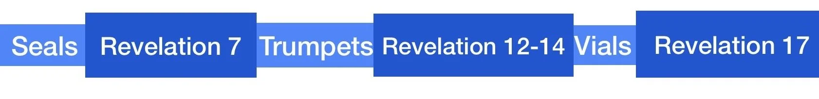 /In the book of Revelation, the core movement chronologically is driven by the opening of the seals, the blowing of the trumpets and the pouring out of the vials. Within the moving forward of these actions, certain chapters are inserted and the action is paused while these chapters or smaller passages reveal generalized information about what is happening during the timeframe of these last days.